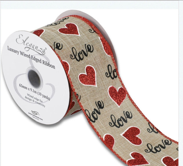 Wired Glitter Heart/Love Natural Ribbon 63mm - £1 per metre